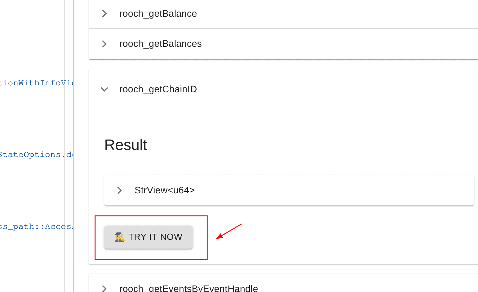 We click on the rooch_getChainID method, click the TRY IT NOW button, and the calling page will be displayed at the bottom of the page, as shown below.