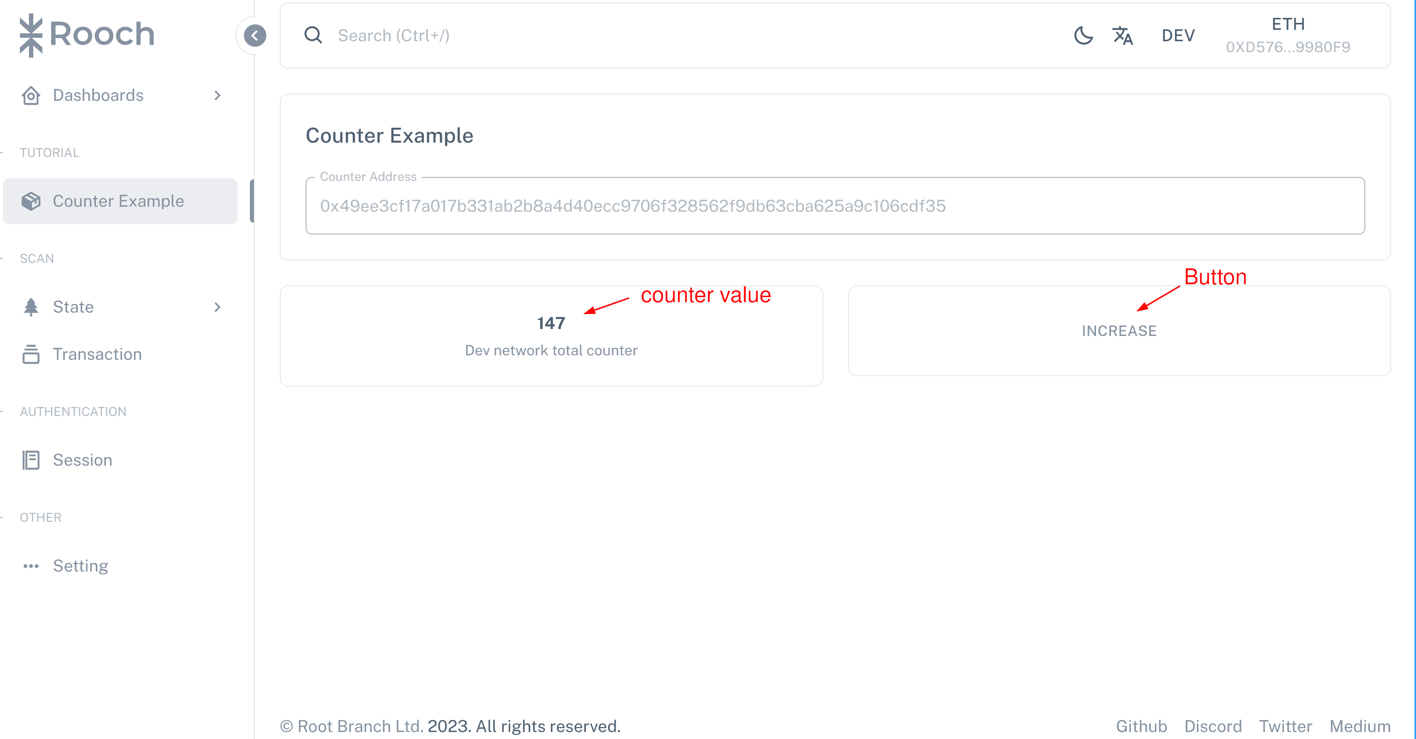 A Counter example is deployed by default in the Dashboard. We can directly experience its counting function. The counter value is displayed on the left and the button for incrementing the counter is on the right.