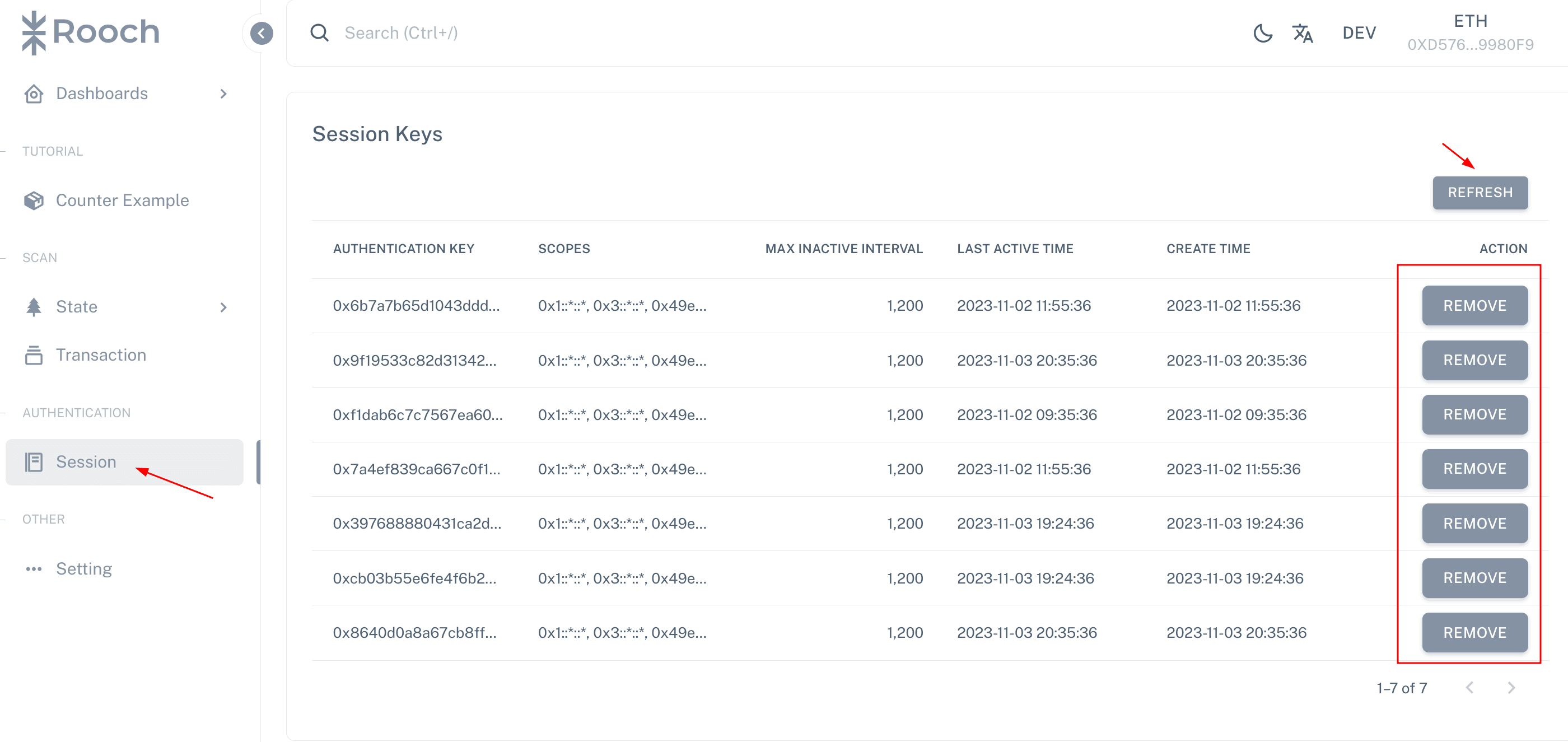 You can click the RRFRESH button to refresh the record list of Session key. The last column of Session key is the button to remove the corresponding Session key.