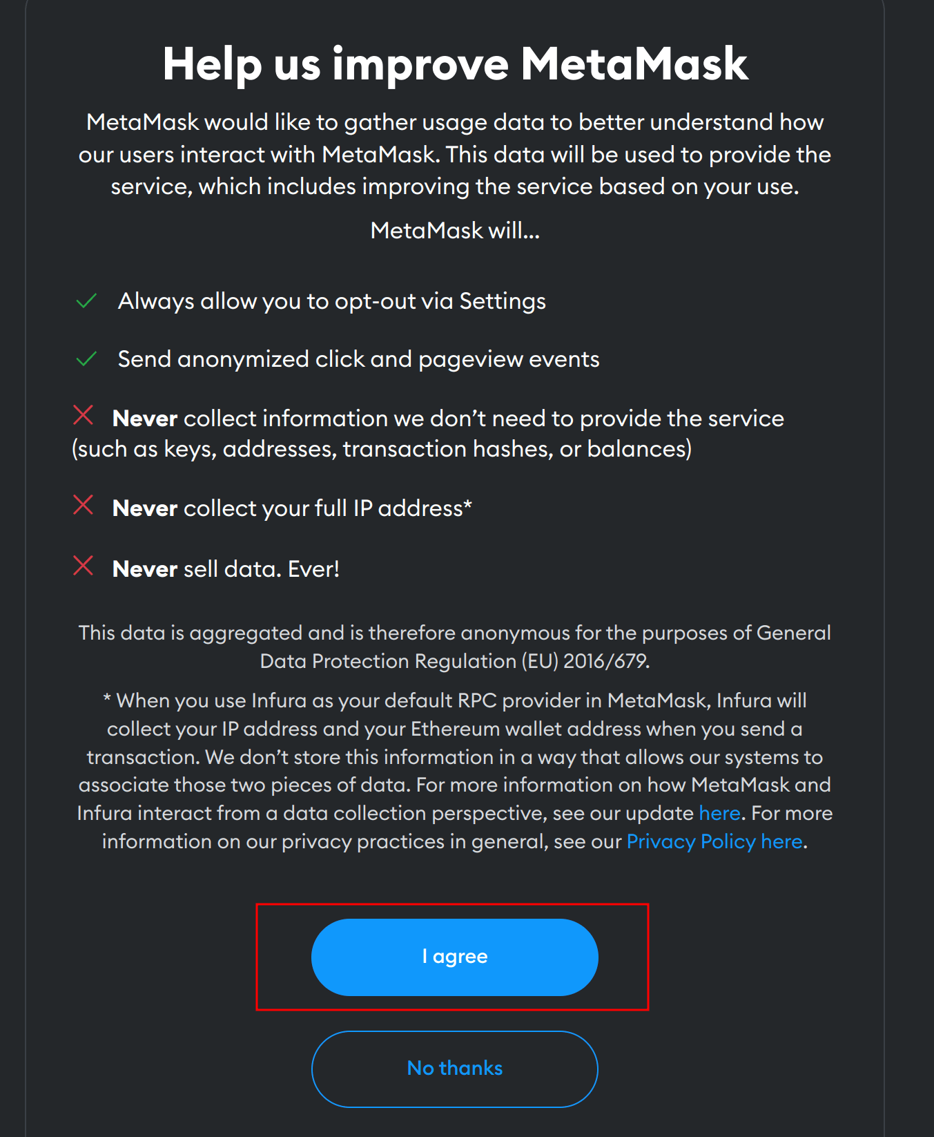 Enter the password to unlock the MetaMask wallet on your local machine, check the terms of use, and click the Create a new wallet button: