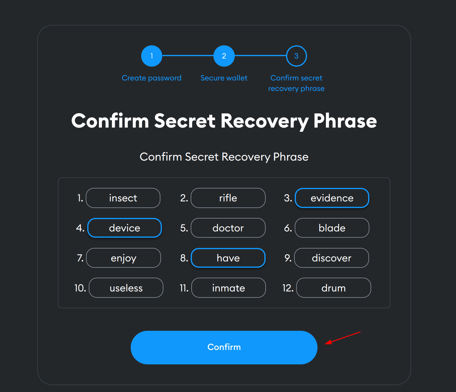 Fill in the missing mnemonic, confirm that the copied mnemonic is correct, and click the confirm button: